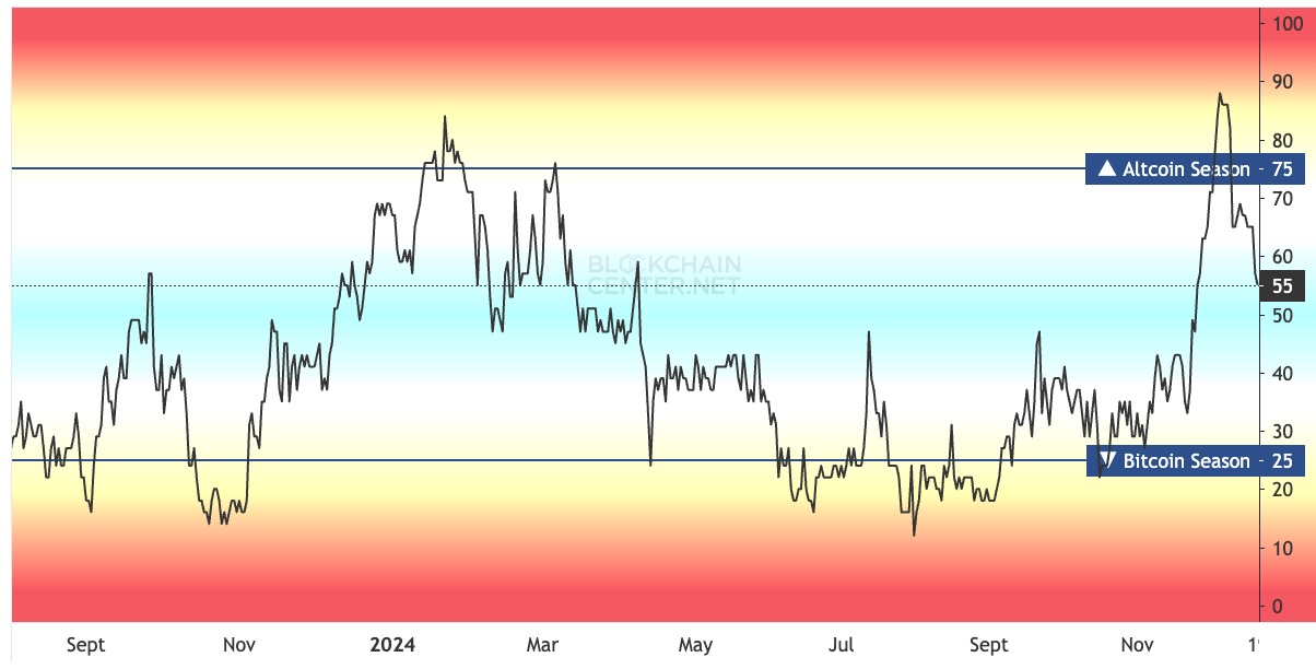 As CoinGape reported, altcoin season index has come crashing further to 55 leading to speculation of the end of the altcoin season. As per the Blockchain Center data, the altcoin season index is currently at 55, testing the crucial support of 50. Crypto market analysts expect a bounce back from here.